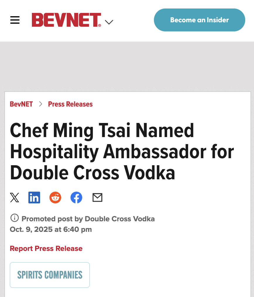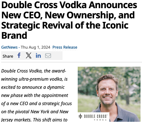 INDUSTRY MAGAZINE Power Players Double Cross Vodka Announces New CEO Chef Ming Tsai Named Hospitality Ambassador for Double Cross Vodka BEVNET: Mitigating Tariff Turmoil Daily News Network: Executive Highlight Double Cross Vodka Announces New CEO